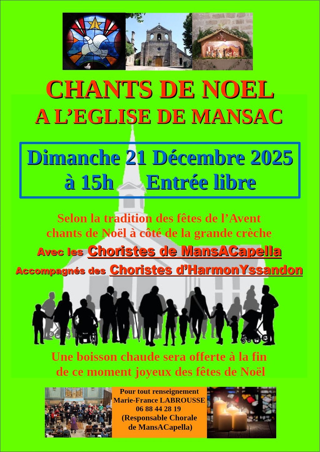 Chants de Noël à l'église de Mansac le dimanche 21 décembre à 15h, avec les choristes de Mansac et d'Yssandon. Entrée libre et gratuite !