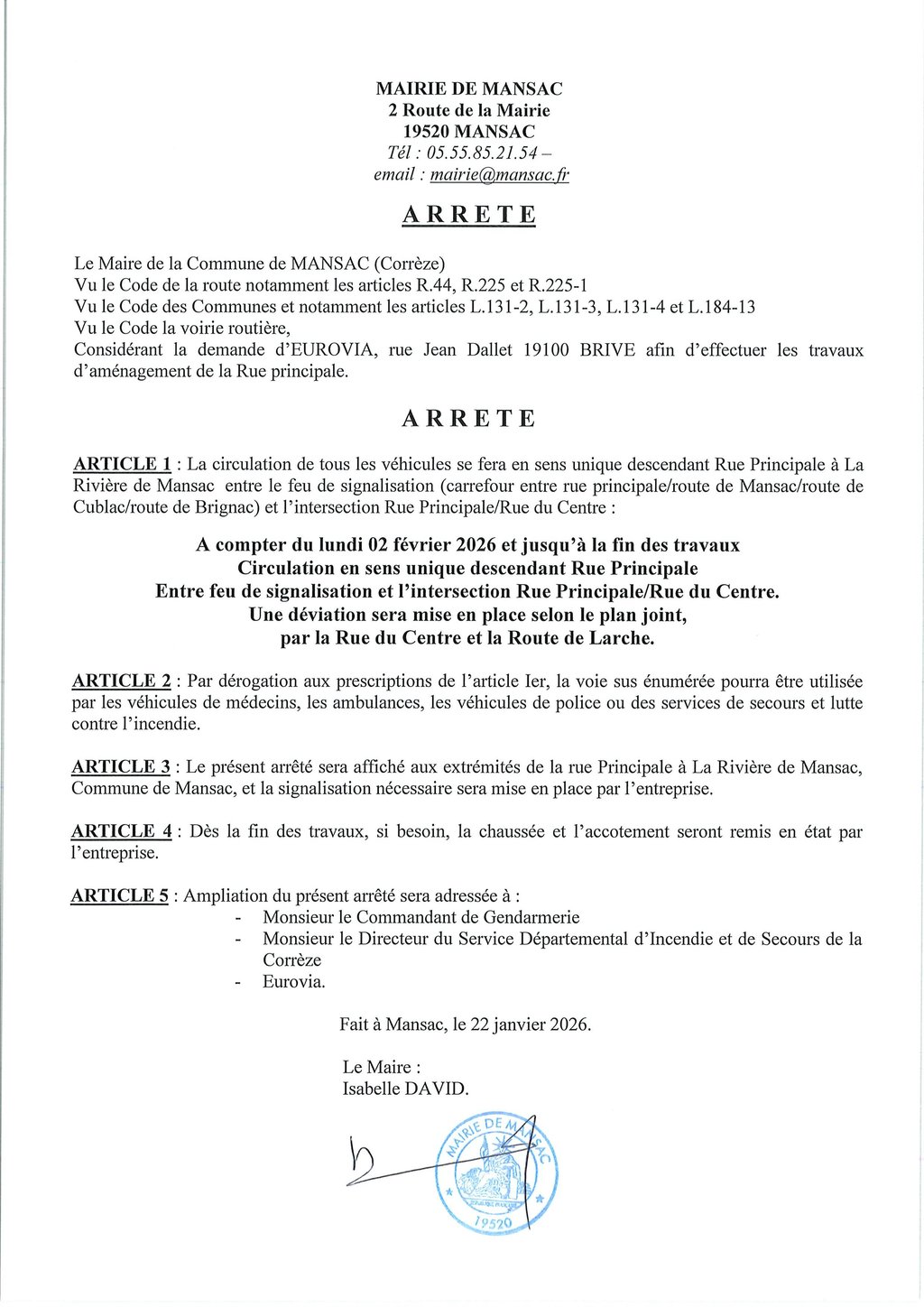 Arrêté municipal portant instauration d'un sens unique de circulation rue Principale
