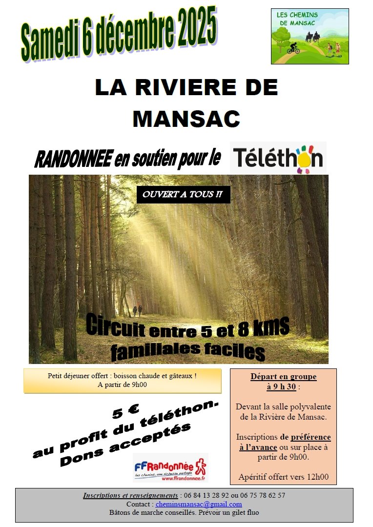 En partenariat avec d'autres associations de la commune les chemins de Mansac organise une petite randonnée au profit du Téléthon.